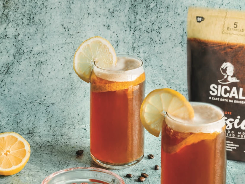 No copo introduza a água, o café expresso, o limão (com casca) cortado em 4 partes, o açúcar, a pitada de sal e pressione 1 segundo na velocidade 8.