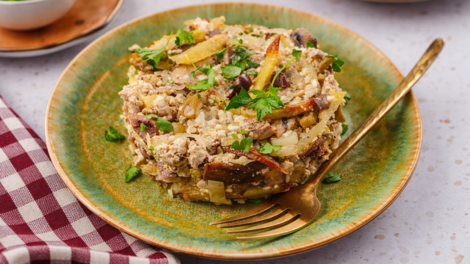 Sirva o tofu à Brás, decorado com azeitonas picadas e polvilhado com salsa picada.