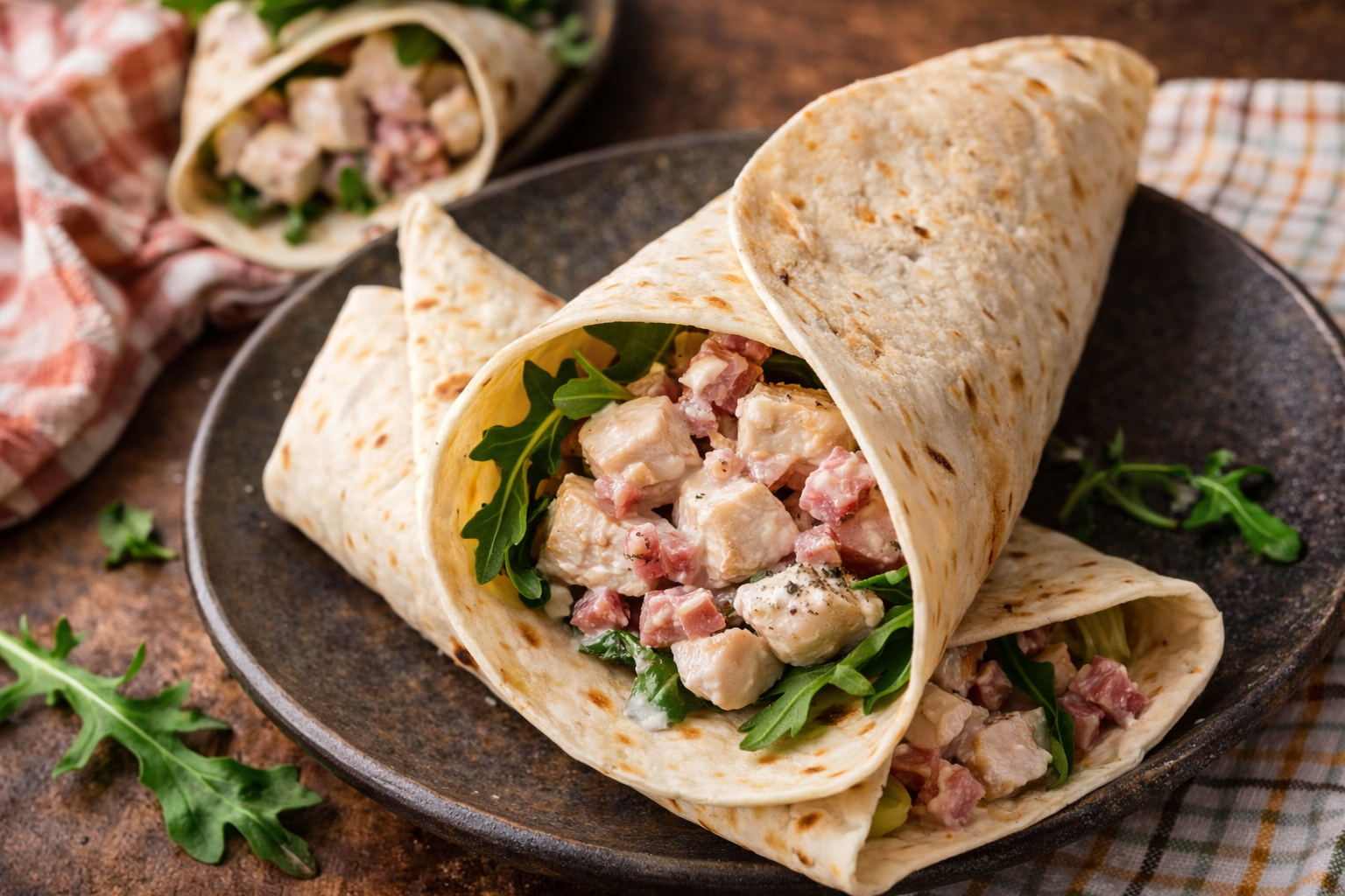 Recheie os wraps com a rúcula e o preparado anterior. Enrole os wraps e feche com um palito.