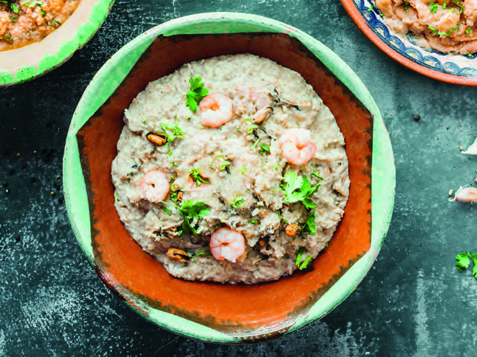 Coloque o alho e os coentros na panela e programe a Função Triturar. Com a espátula baixe o que se acumulou nas paredes. Junte o azeite e programe 5 minutos a 120 °C na velocidade 2. Adicione o miolo de camarão e o miolo dos bivalves - ambos já descongelados e escorridos. Tempere com sal e regule 5 minutos a 120 °C, com a Rotação Inversa na velocidade 1. Com uma escumadeira, retire o marisco e reserve-o, deixando ficar na panela o líquido da cozedura.