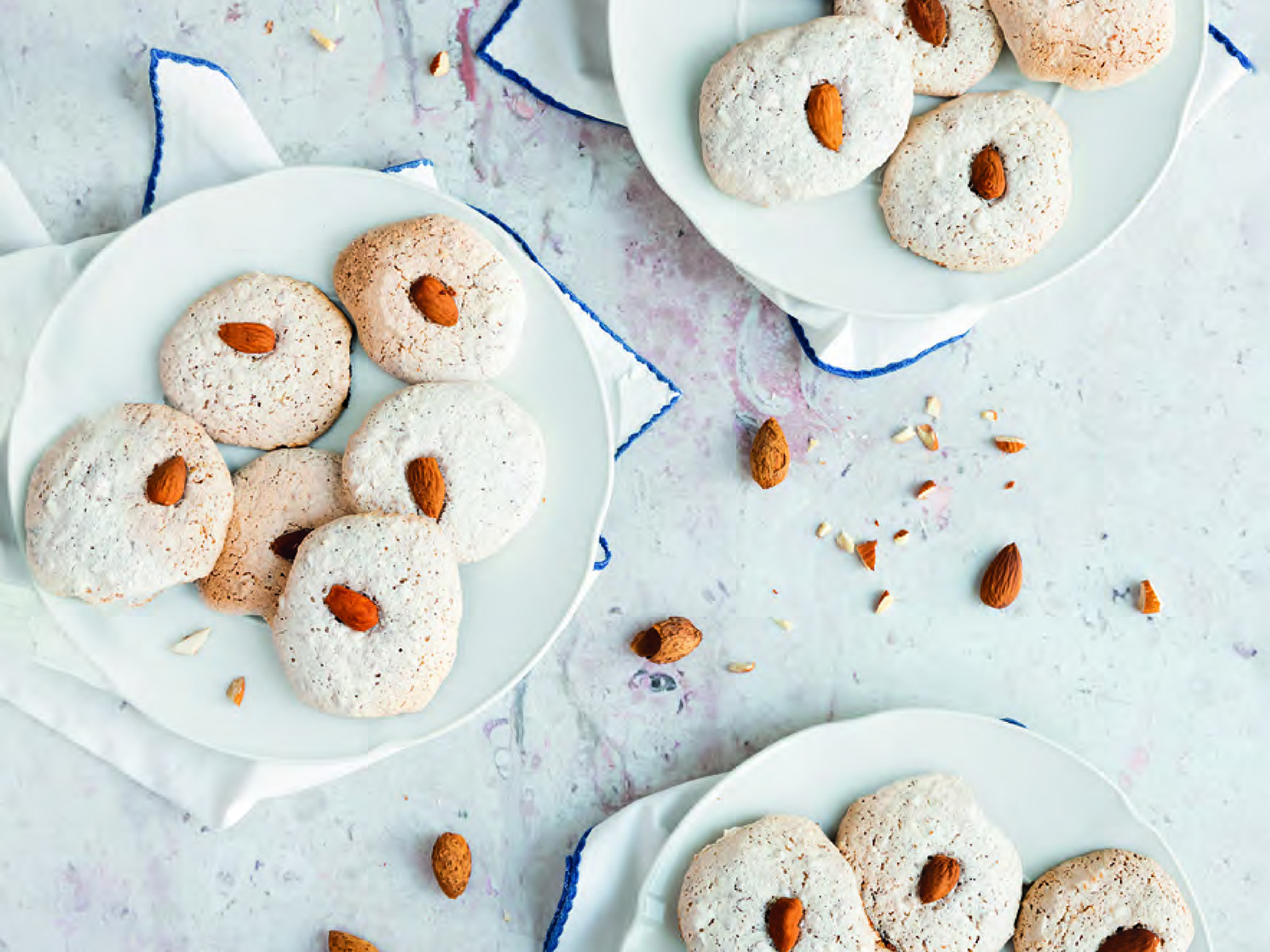 Forre 1 tabuleiro com papel vegetal (pode untar o papel com manteiga). Com a ajuda de uma colher de sobremesa, disponha pequenos montinhos de massa (cerca de 20 g cada), afastados entre si. Coloque uma amêndoa sobre cada um. Leve ao forno (120 ºC) cerca de 60-70 minutos.
