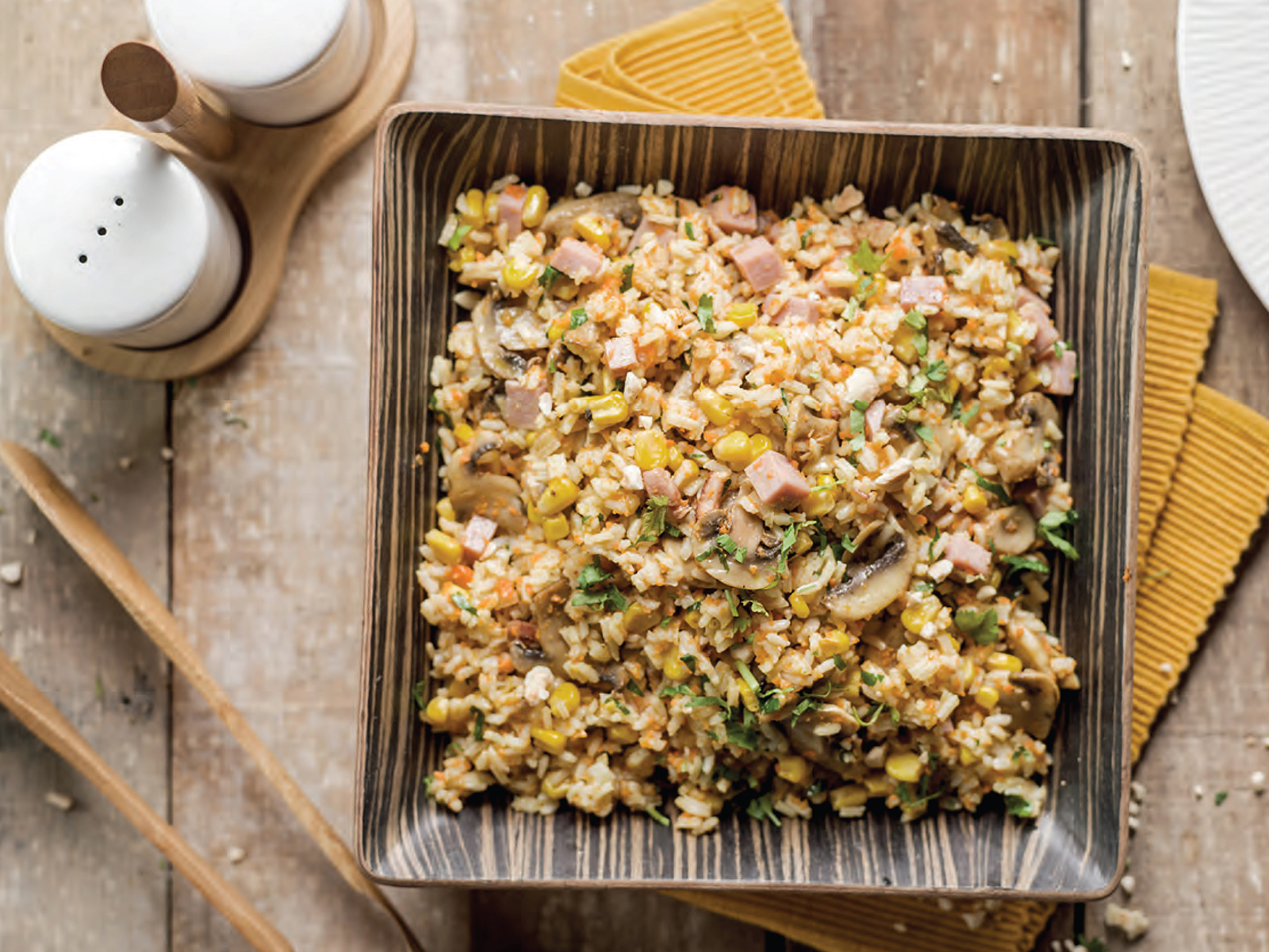 Adicione a água e o sal ao refogado e coloque o arroz no cesto, polvilhando-o com sal fino a gosto.