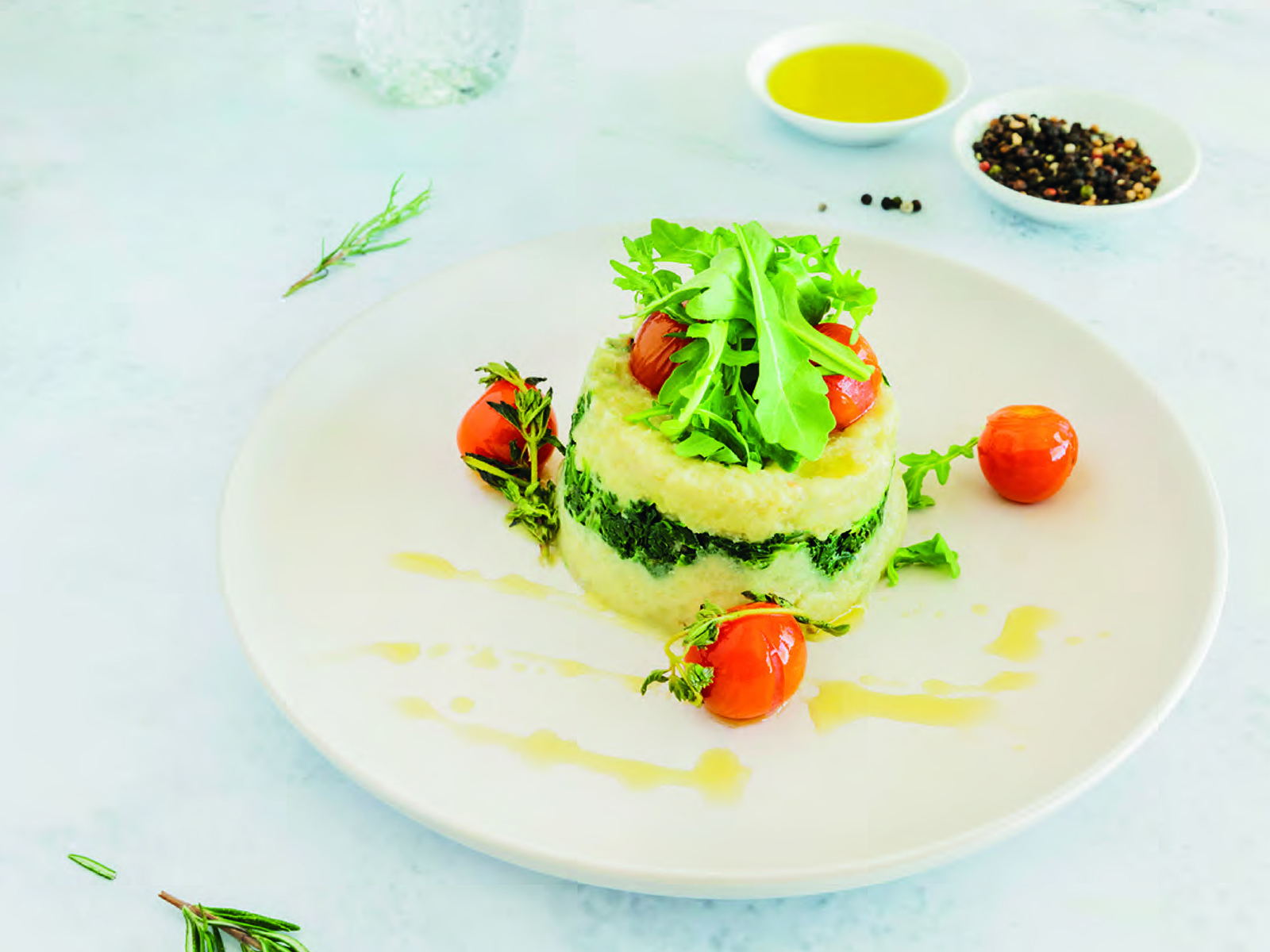 Finalize com folhas de rúcula e tomate-cereja salteado em azeite e alecrim. Sirva de imediato.