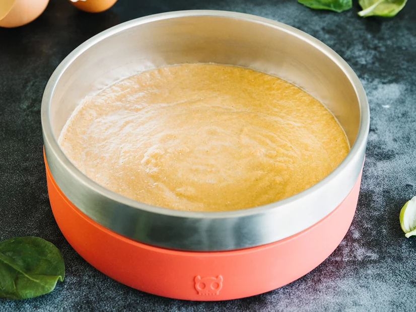Coloque na panela os iogurtes, os ovos partidos com a casca, a curgete e a cenoura cortadas em pedaços, os espinafres e o óleo de salmão. Programe 3 minutos na velocidade 11.