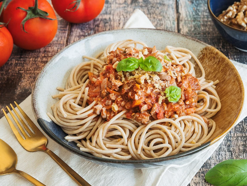 Sirva a bolonhesa vegan com a restante noz picada por cima. Decore com coentros a gosto.