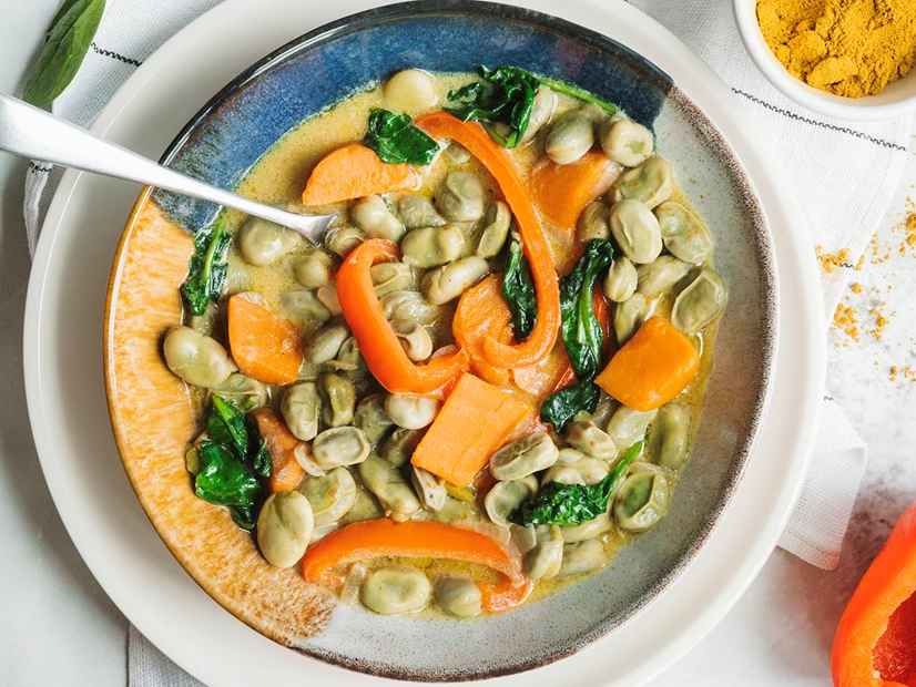 Adicione as favas cozidas e escorridas, o caril, o gengibre ralado, o leite de coco, sal e piripíri a gosto e programe 5 minutos a 100ºC na velocidade 1 com a Rotação Inversa.
