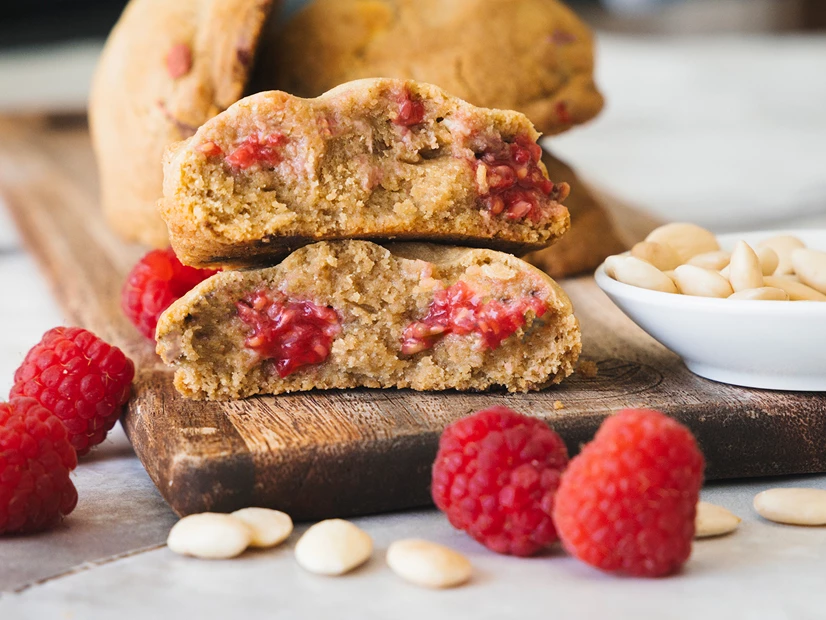 Adicione as framboesas, envolva-as na massa com a espátula e programe 30 segundos na velocidade 2. Se necessário, termine de envolver com a espátula.