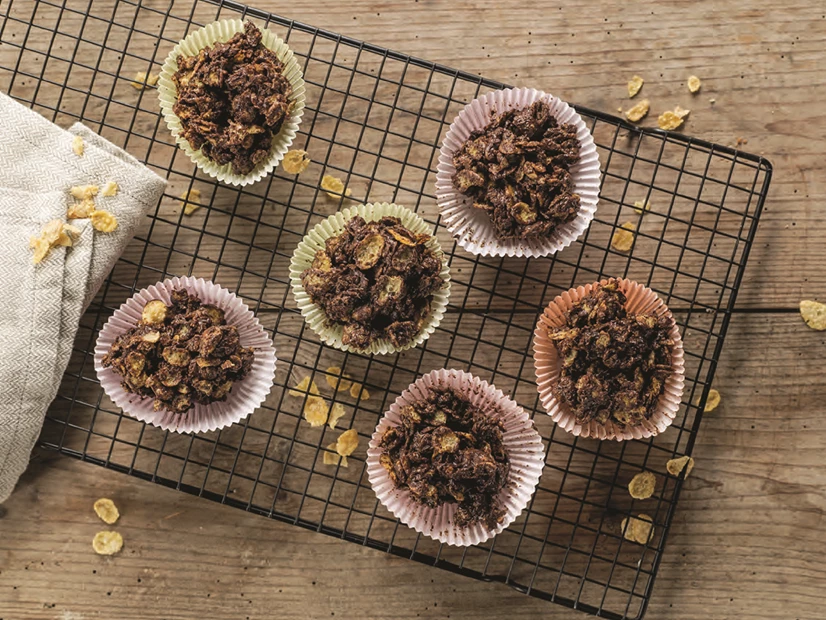 Retire e envolva com a espátula, certificando-se que o chocolate fica uniformemente espalhado por todos os cereais. Disponha pequenos montinhos do preparado nas forminhas de papel e leve ao frigorífico 30 minutos para solidificar.