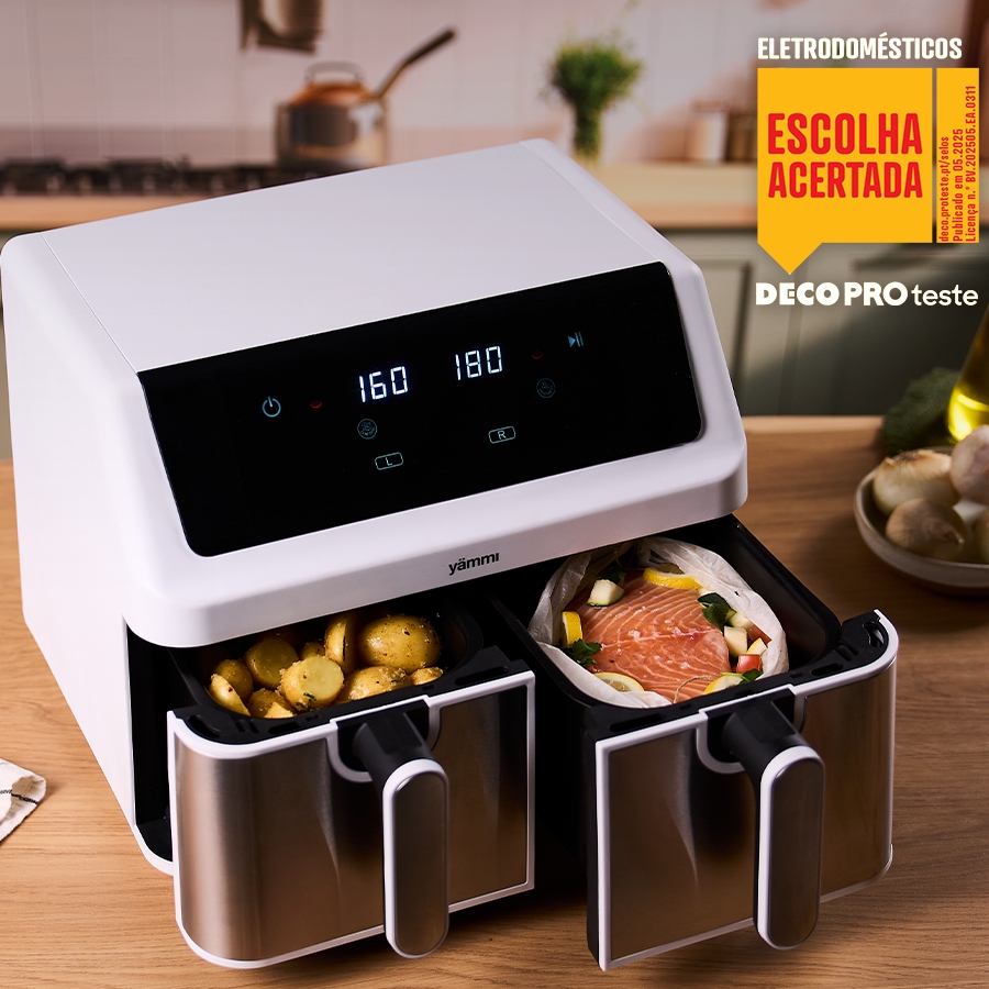 Duas fritadeiras numa só? Sim, é possível! A nova Fritadeira Dupla Sem Óleo 9L Yämmi, permite cozinhar dois pratos ao mesmo tempo e sem complicações! Com dois cestos de 4,5L e oito programas inteligentes, consegue preparar refeições saudáveis e rápidas para toda a família. Mais variedade, menos tempo na cozinha