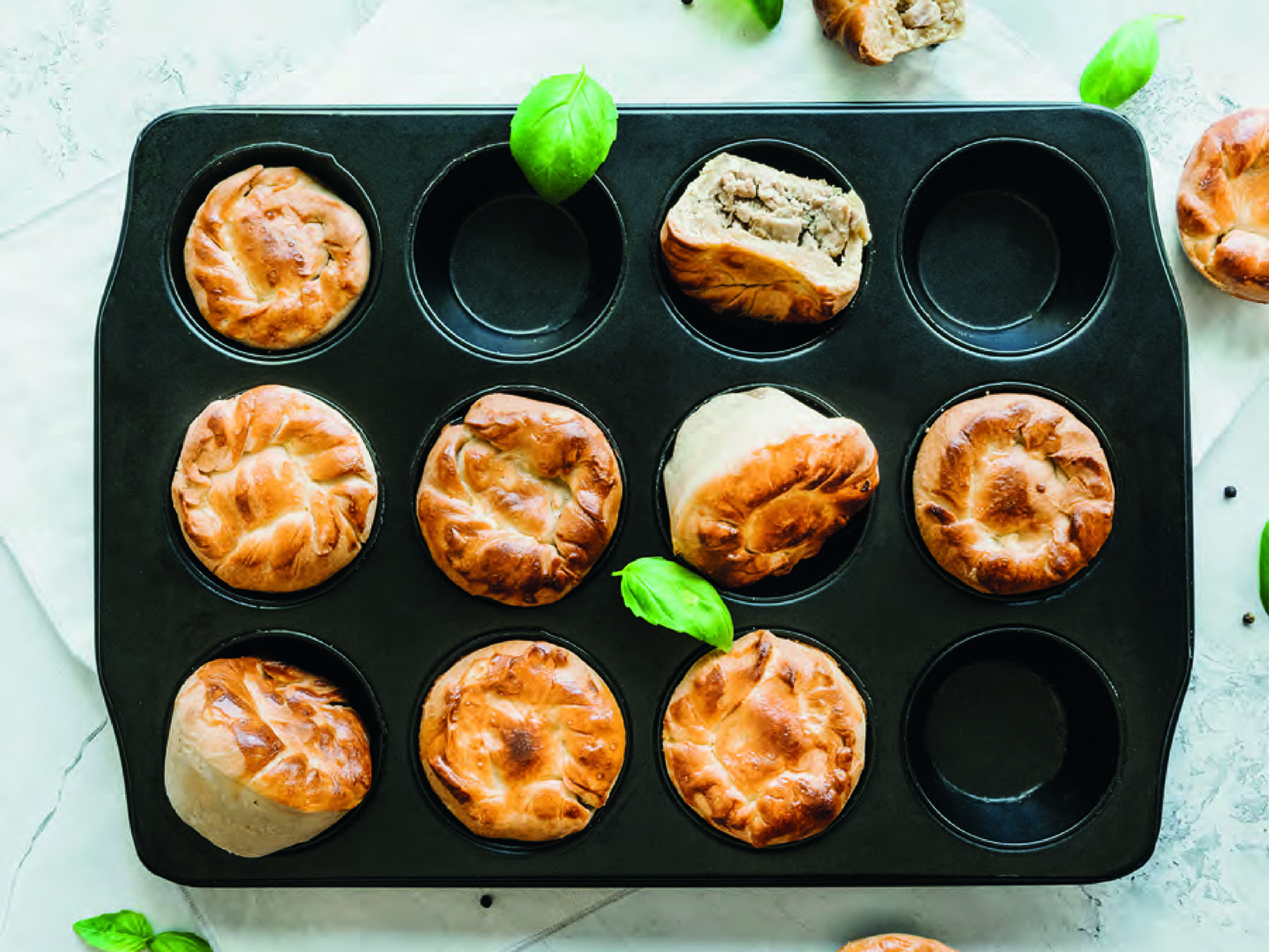 Entretanto, pré-aqueça o forno a 180 ºC. Unte as formas com manteiga. Com a ajuda de um rolo, estenda a massa e forre as formas com a mesma (deixe uma parte da massa para fazer as “tampas” das empadas).