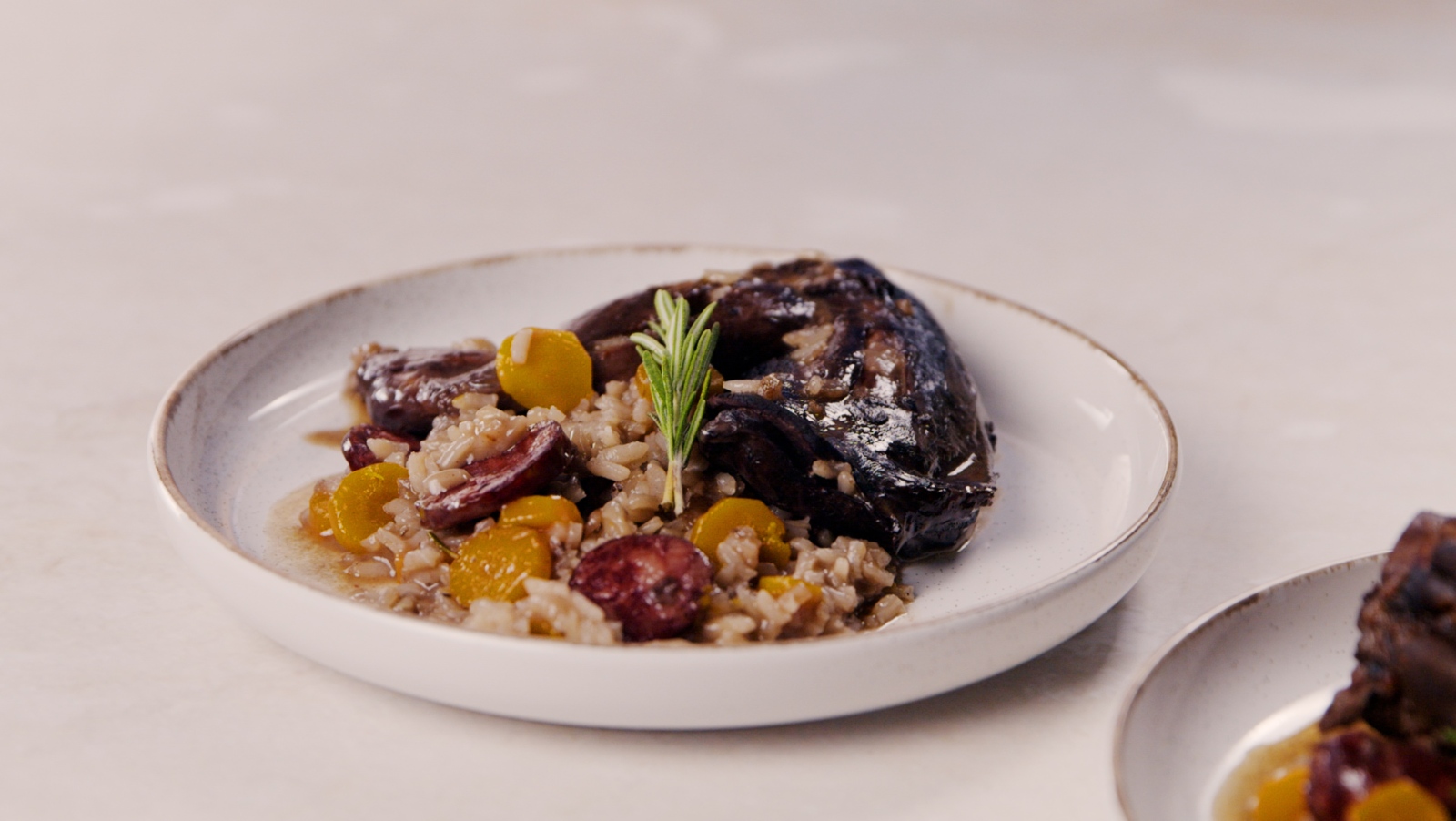 Acrescente o vinho, envolva com a espátula e regule 30 minutos a 100 ºC, com a Rotação Inversa na velocidade 1. Retire o louro e reserve.