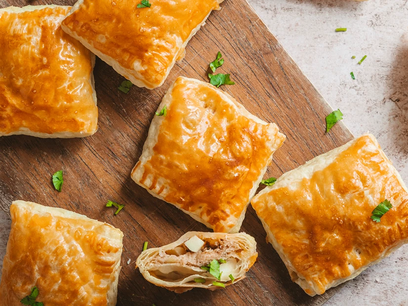 Coloque os folhados sobre dois tabuleiros forrados com papel vegetal. Pincele-os com as gemas de ovo e leve ao forno cerca de 25 minutos.
