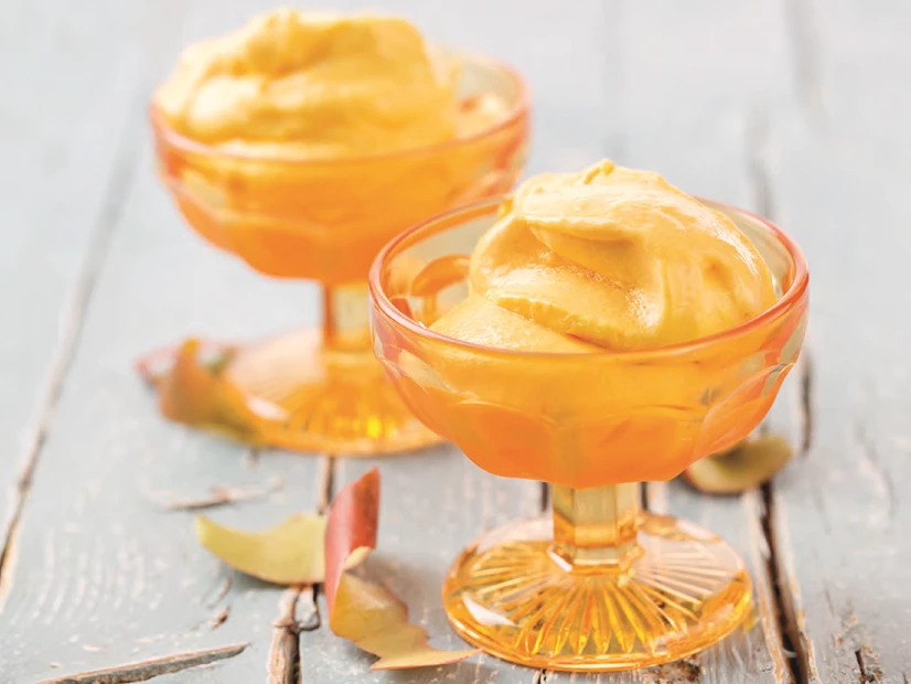 Misture previamente a manga cortada aos pedaços com a polpa e leve ao congelador até endurecer.