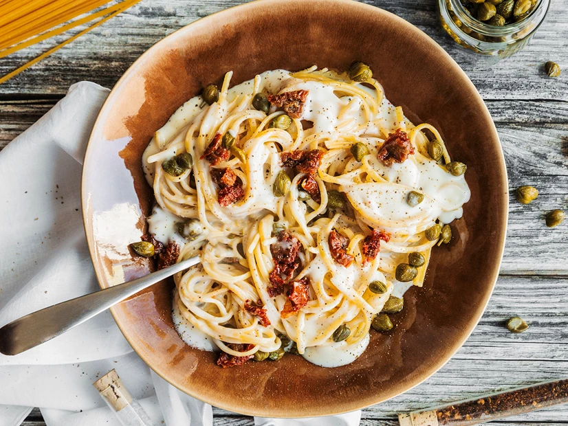 Envolva o molho com a massa. Sirva de imediato com as alcaparras escorridas reservadas e o tomate seco cortado em cubinhos. Polvilhe com pimenta preta.