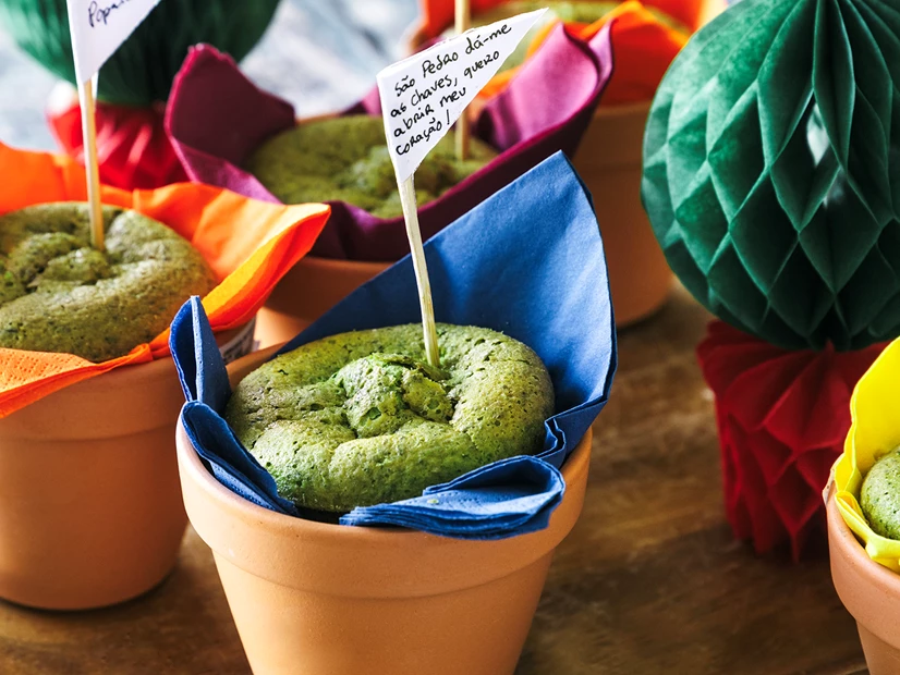 Forre vasos pequenos com guardanapos de papel coloridos e coloque um muffin em cada um. Decore a gosto com enfeites alusivos aos Santos Populares.