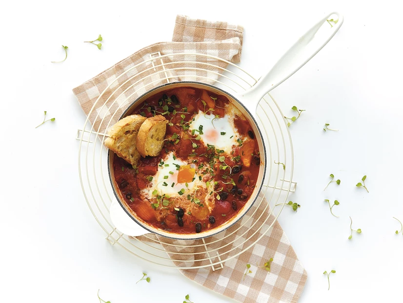 Transfira o preparado para duas frigideiras, junte o feijão e abra os ovos por cima. Leve ao forno durante 10 minutos.
