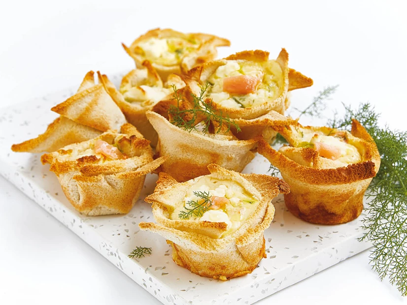 Forre 10 formas de muffin com o pão, distribua por cima a mistura de ovo, coloque 1 colher de chá de queijo creme em cada uma e leve ao forno durante 20 minutos.