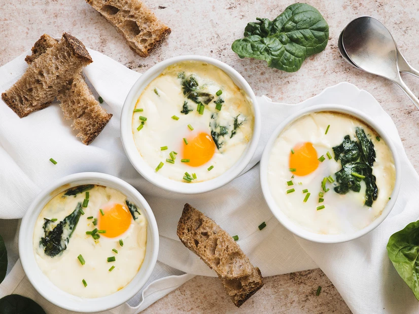 Retire os ramequins. Sirva os ovos cocotte de imediato, polvilhados com cebolinho picado. Acompanhe com pão fatiado, palitos de pão torrados ou tostas.