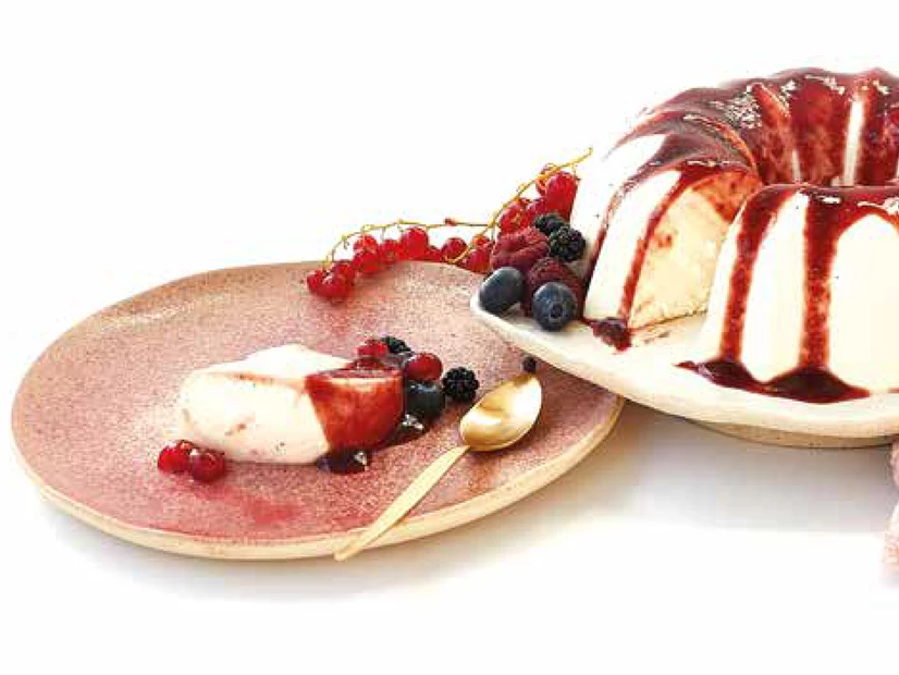 Desenforme e sirva bem fria com o molho de frutos vermelhos.