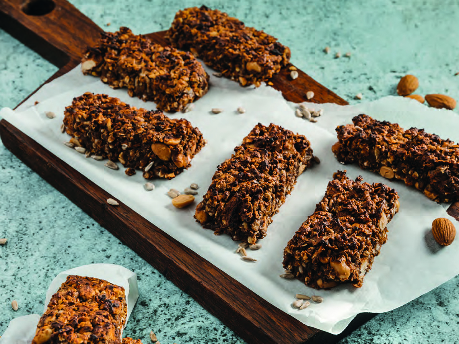 Junte a farinha sem fermento, a farinha de alfarroba, 1 c. de chá de sal e as sementes de sésamo (opcional). Regule 2 minutos na Função Amassar.
