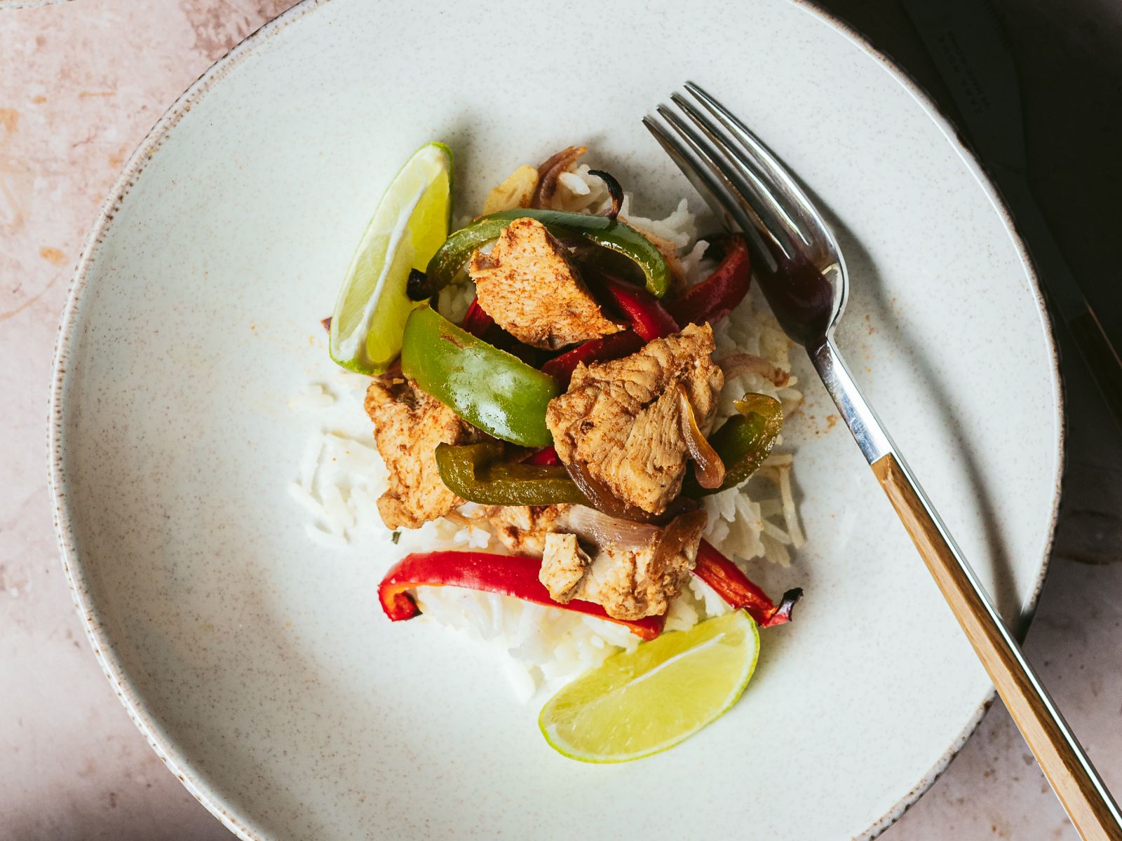 Adicione o frango cortado em tiras finas, o caril em pó, sal a gosto, pimenta a gosto e programe 10 minutos a 100 ºC na velocidade 1 com a Rotação Inversa. De seguida, programe 7 segundos na velocidade 4.