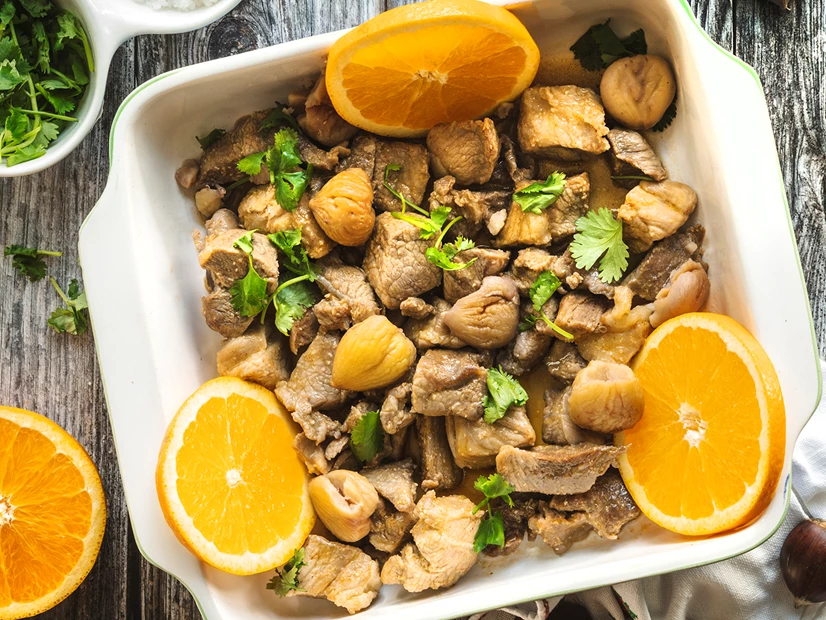 Numa travessa, envolva delicadamente a carne com as castanhas. Polvilhe com coentros picados e decore com laranja fatiada. Sirva de imediato.