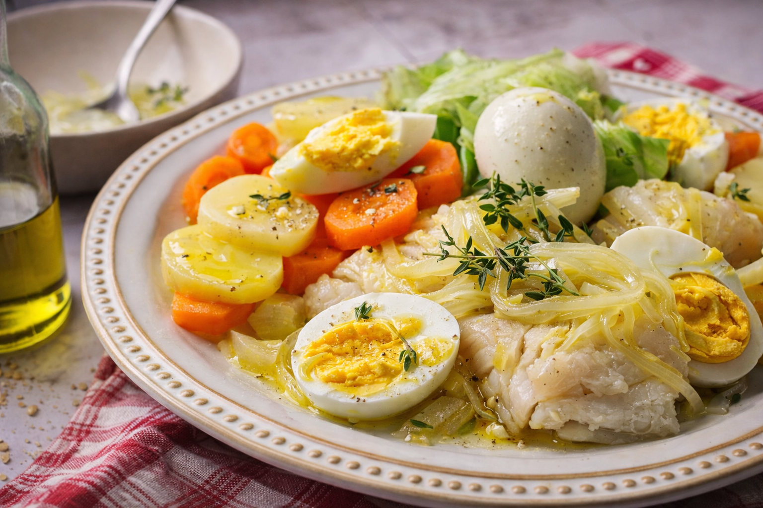 Tempere o salmão com azeite, sal, pimenta, o sumo de limão, tomilho ou endro. Reserve.