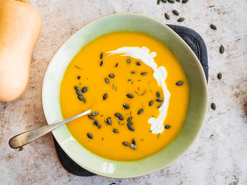 Sirva a sopa com sementes de abóbora tostadas e com pimenta preta moída. Opcionalmente, decore com cebolinho cortado e com um fio de natas (light ou de soja).