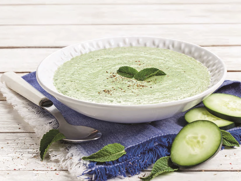 Coloque no copo o pepino cortado em pedaços e sem sementes, o iogurte, o sal, a pimenta, a hortelã e o vinagre.