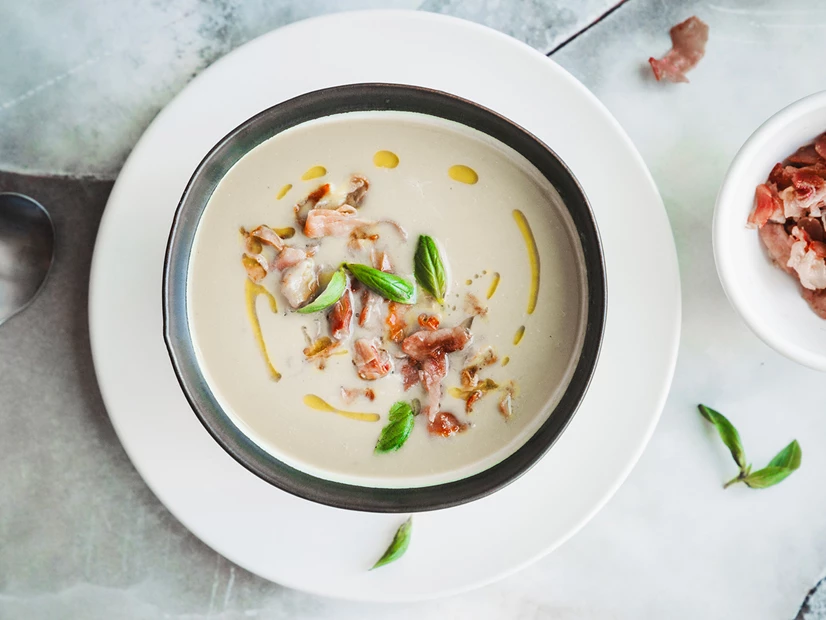 Sirva a sopa bem fria em taças individuais. Divida o presunto crocante (pode partir as fatias em pedaços maiores ou menores) pelas taças. Finalize com um fio de azeite e pimenta preta moída. Decore com folhas de manjericão.