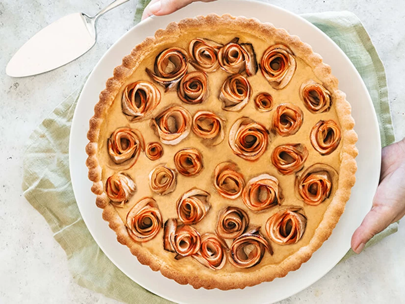 Para fazer as “rosas”: disponha oito fatias de maçã uma a seguir à outra, ligeiramente sobrepostas. Enrole-as em caracol cuidadosamente para formar uma rosa, e coloque-as sobre o creme (com a casca virada para cima). O creme deve ficar totalmente coberto com “rosas”.