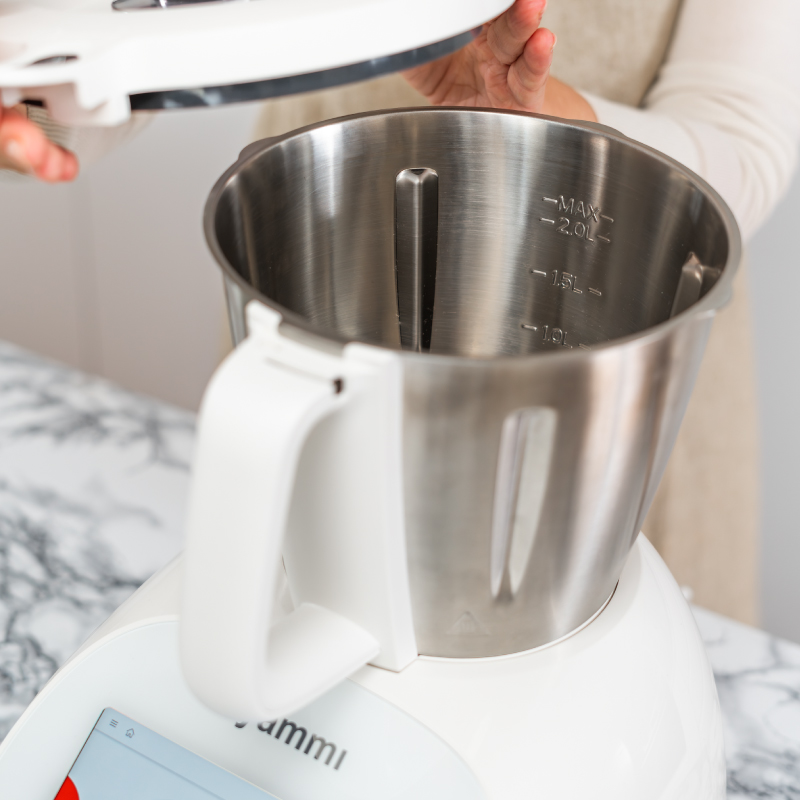 Conjunto de acessórios incluídos na Yämmi 3 para o auxiliar em todas as receitas: copo medidor, lâmina, cesto, bandeja a vapor, misturador, espátula e tampa do corpo da máquina